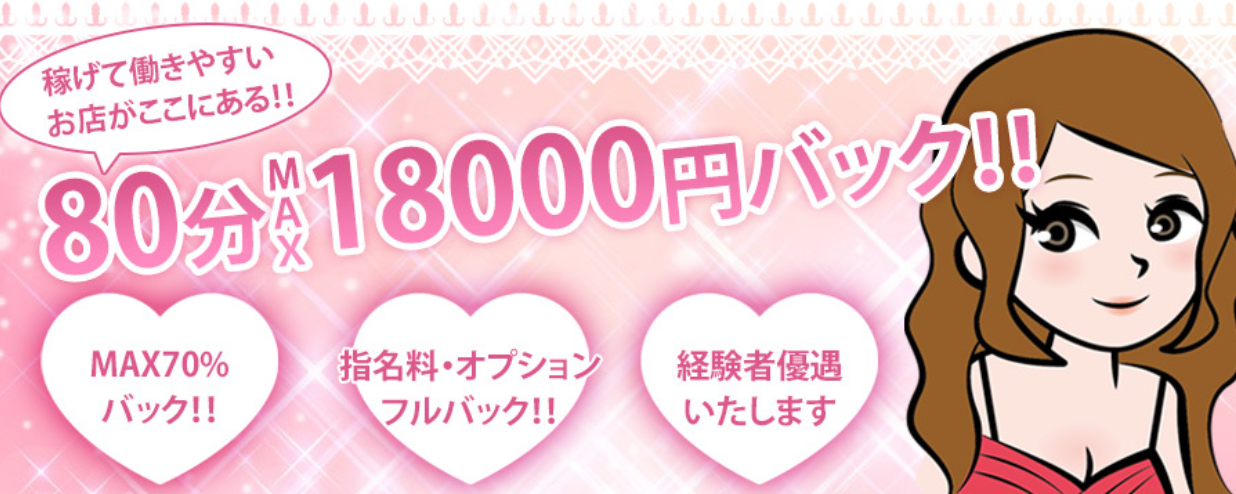 | 給与 | ☆完全歩合制(歩合50%〜70%、経験者優遇) ☆指名料フルバック ☆オプション料フルバック ☆MAX80分18,000円バック! ☆日給80,000円以上稼げます! |