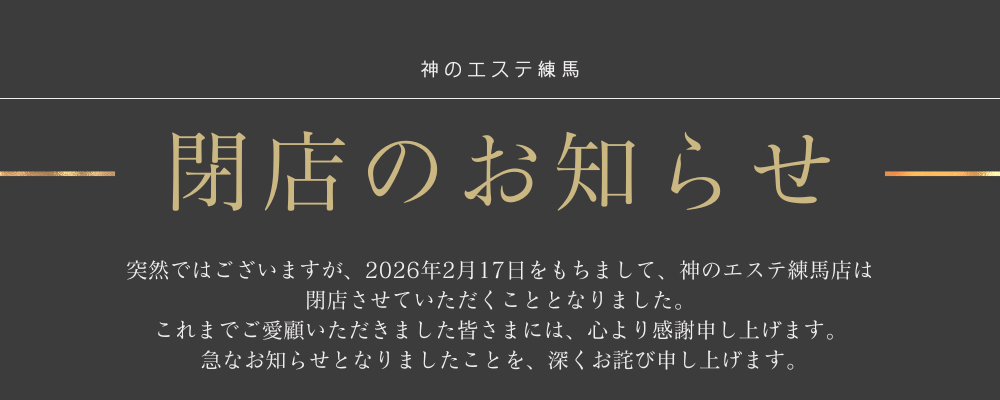 神のエステ練馬店は、2026年2月17日をもちまして閉店させていただくこととなりました。